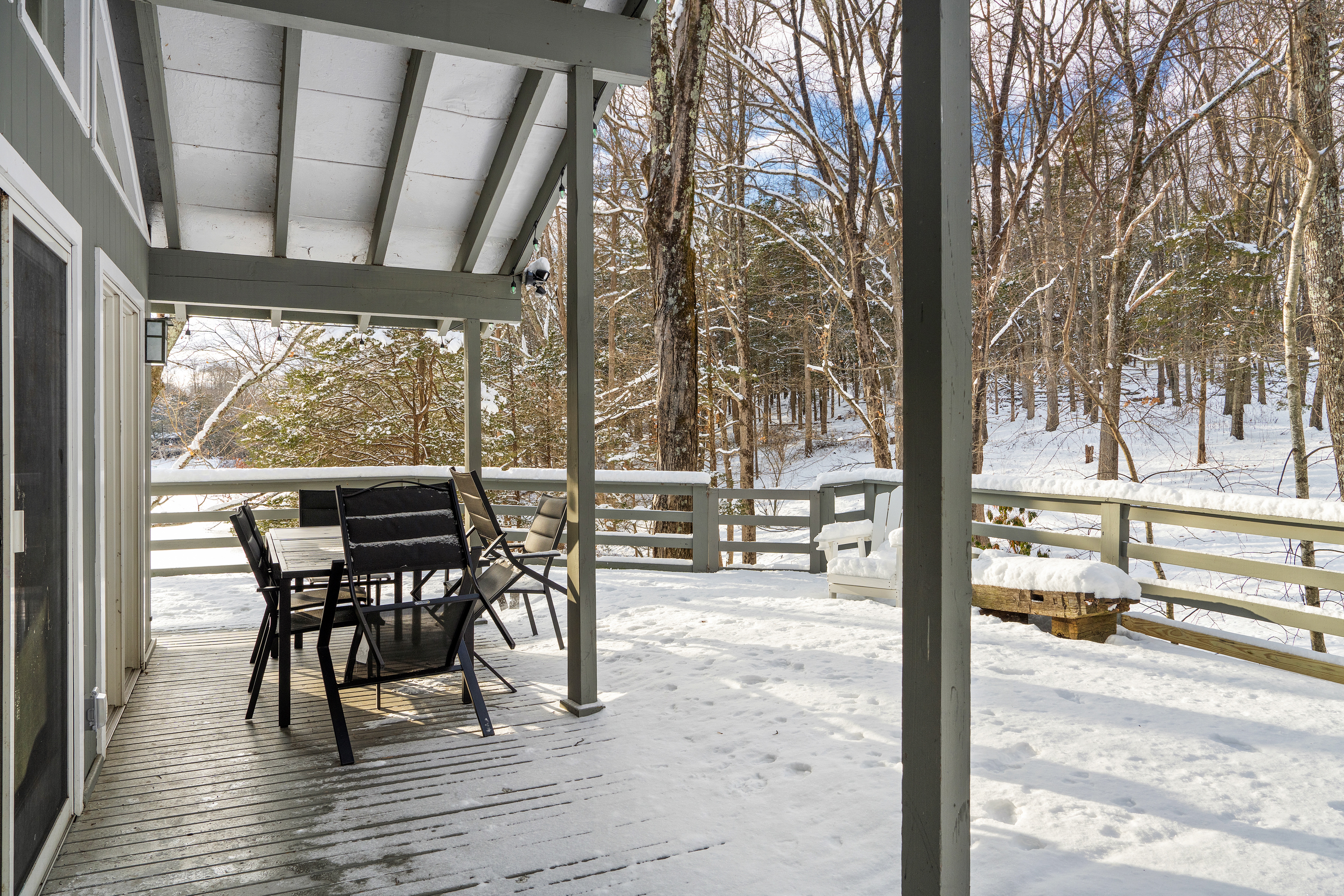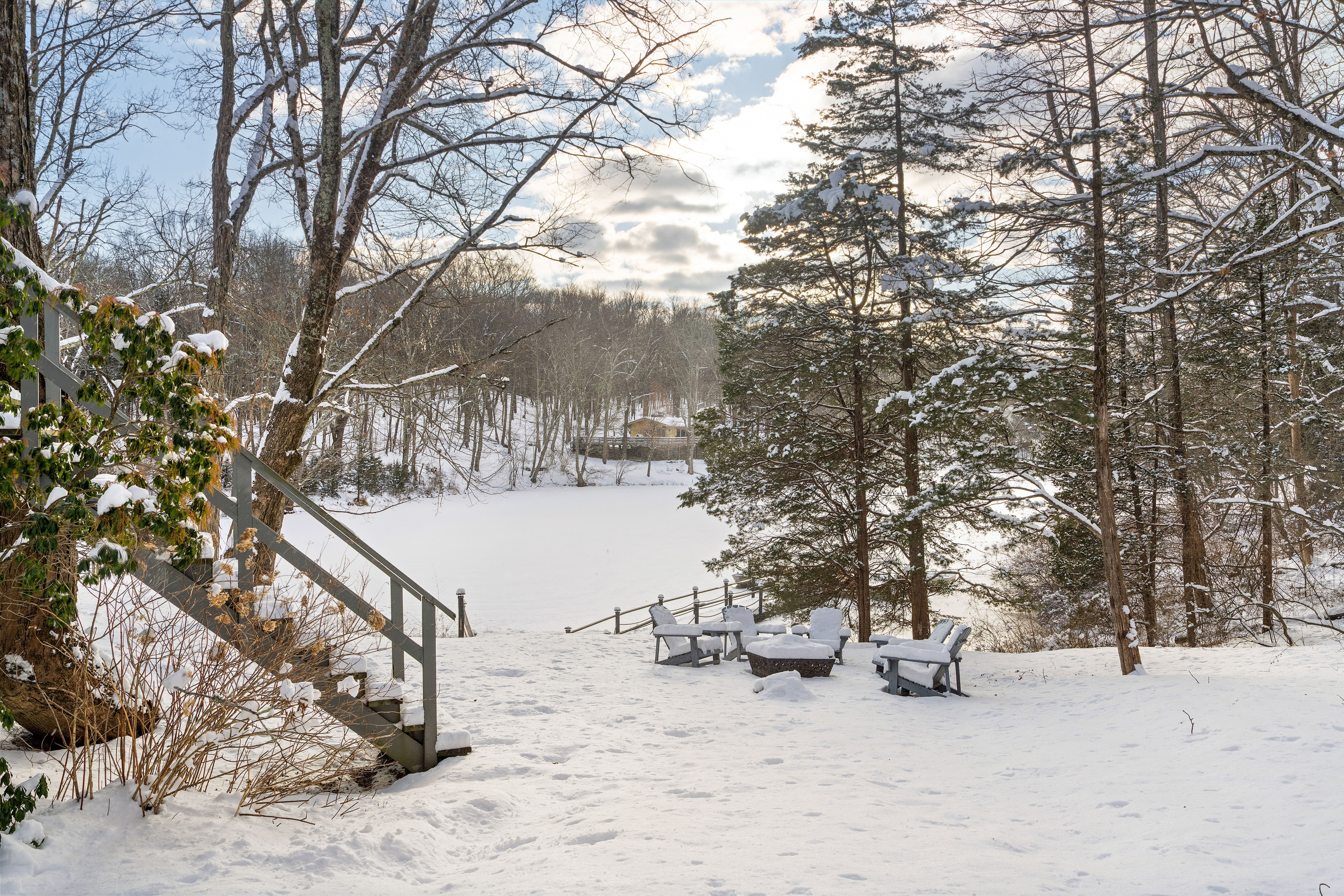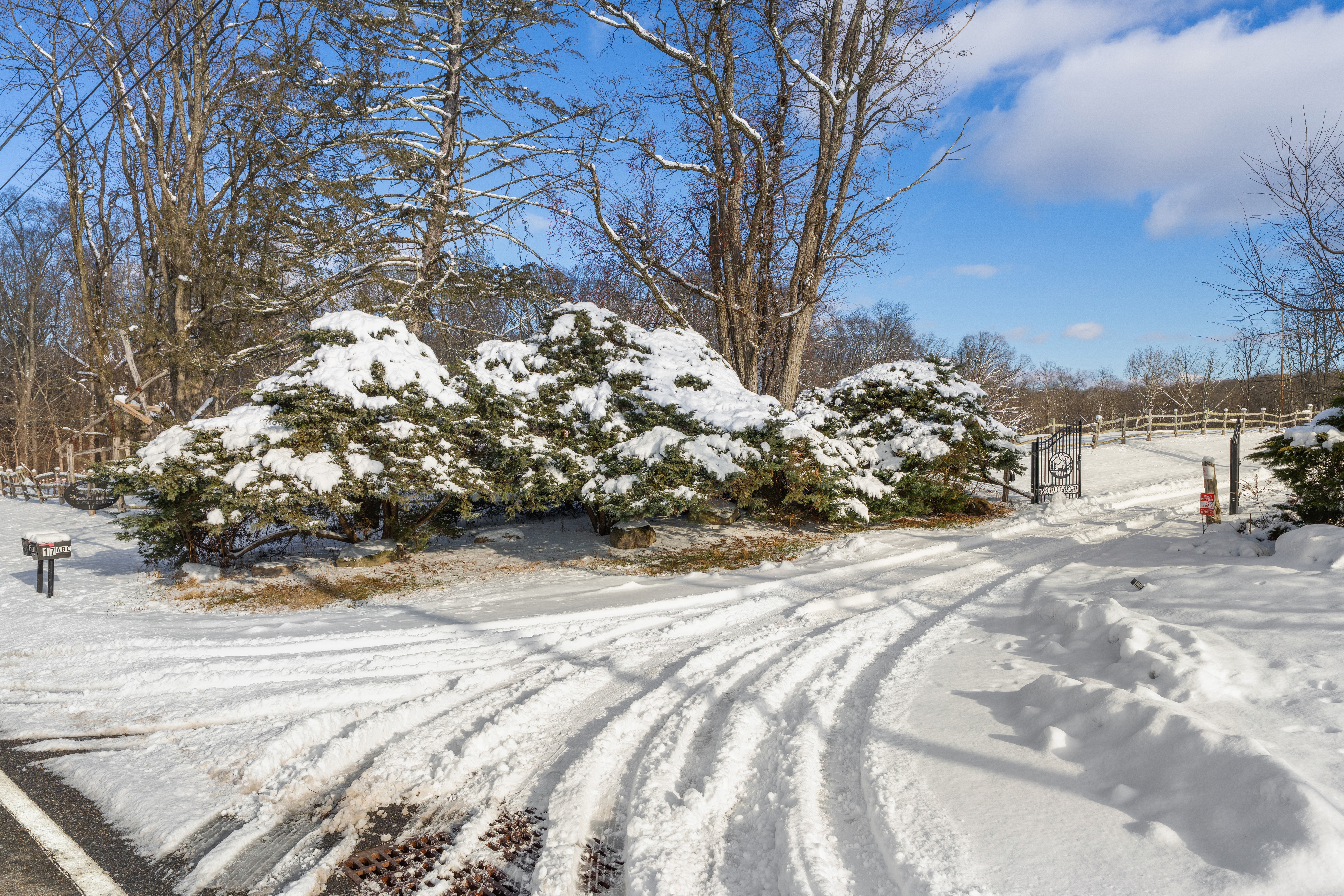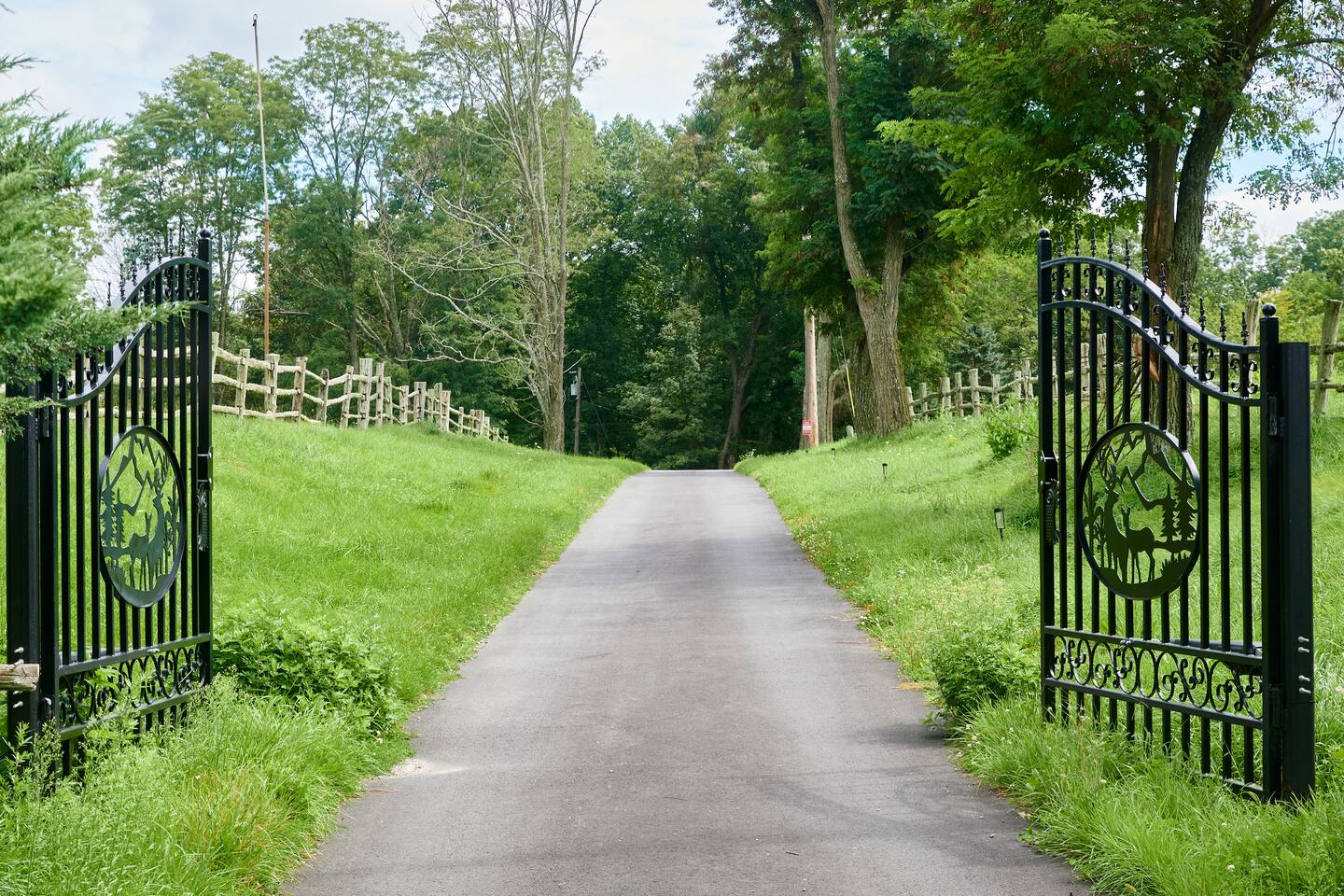 The property is completely open with no fencing, aside from the front gate. You’re welcome to enjoy the tennis court, lake, and hiking trails, but please be mindful of our neighbors’ boundaries. Property lines are clearly marked with either a stone wall or POSTED / PRIVATE PROPERTY signs. All guests or visitors to the property must be counted and announced in advance. No surprise visitors or parties are allowed without prior knowledge.